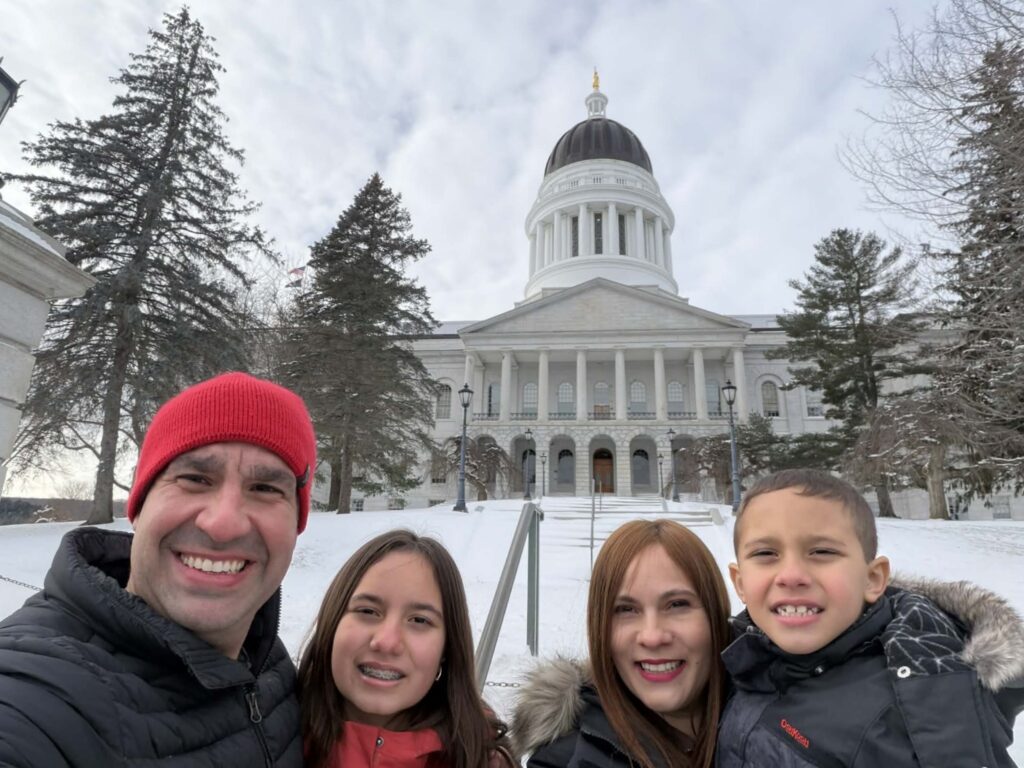La nieve solo nos permitió tomarnos un selfie frente al capitolio de Augusta, Maine.